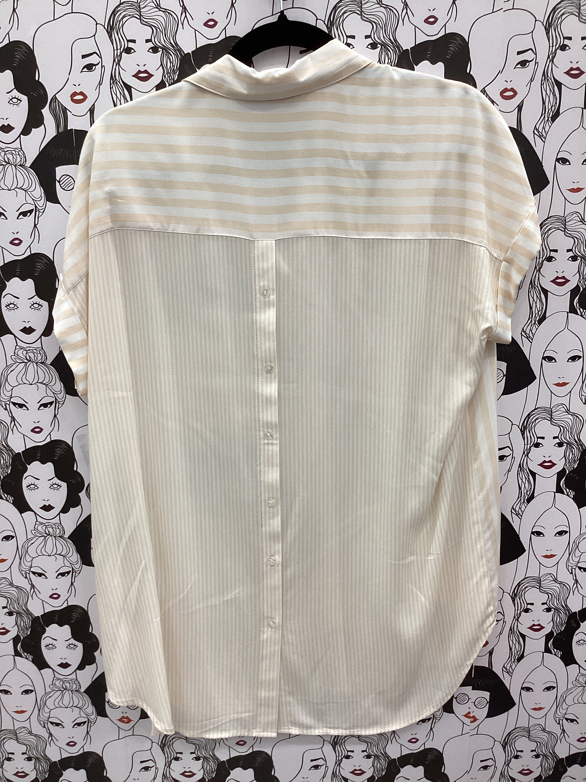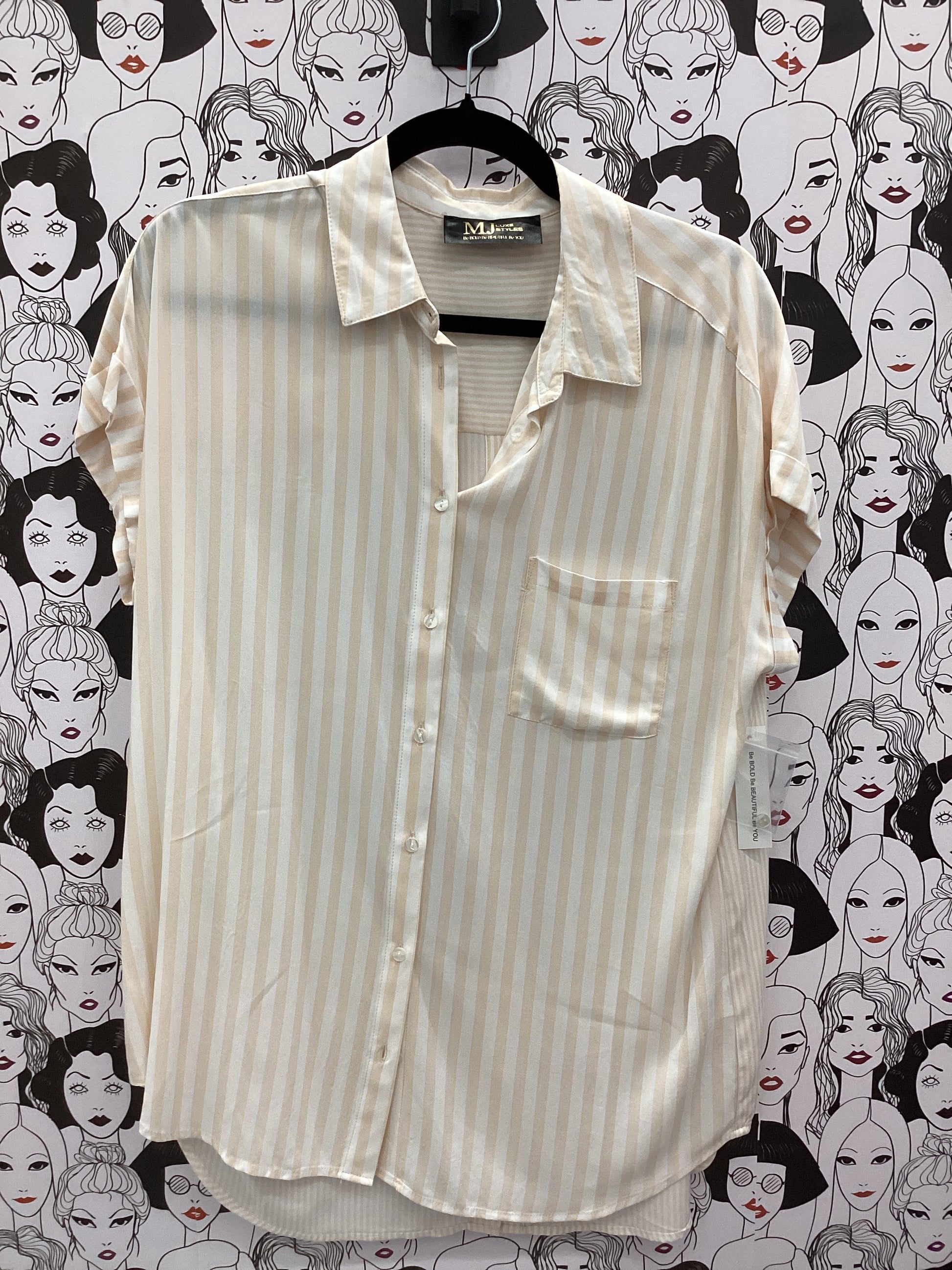Introducing the must-have for your wardrobe: our Orange and White Striped Blouse. This button-up blouse will elevate any outfit with its classic stripes and bright pop of color. Made with the highest quality materials, it is both fashionable and comfortable. Perfect for any occasion.